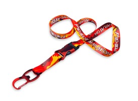 Standardowa długość po zszyciu: 350 mm dłuższy odcinek, 100 mm krótszy odcinek z klamrą i karabińczykiem „Rybka” (+/- 1 cm.). Po konsultacji z działem Obsługi Klienta długość taśmy można dostosować indywidualnie. Mechanizm bezpieczeństwa pękający pod określonym obciążeniem, by zminimalizować ryzyko urazu.